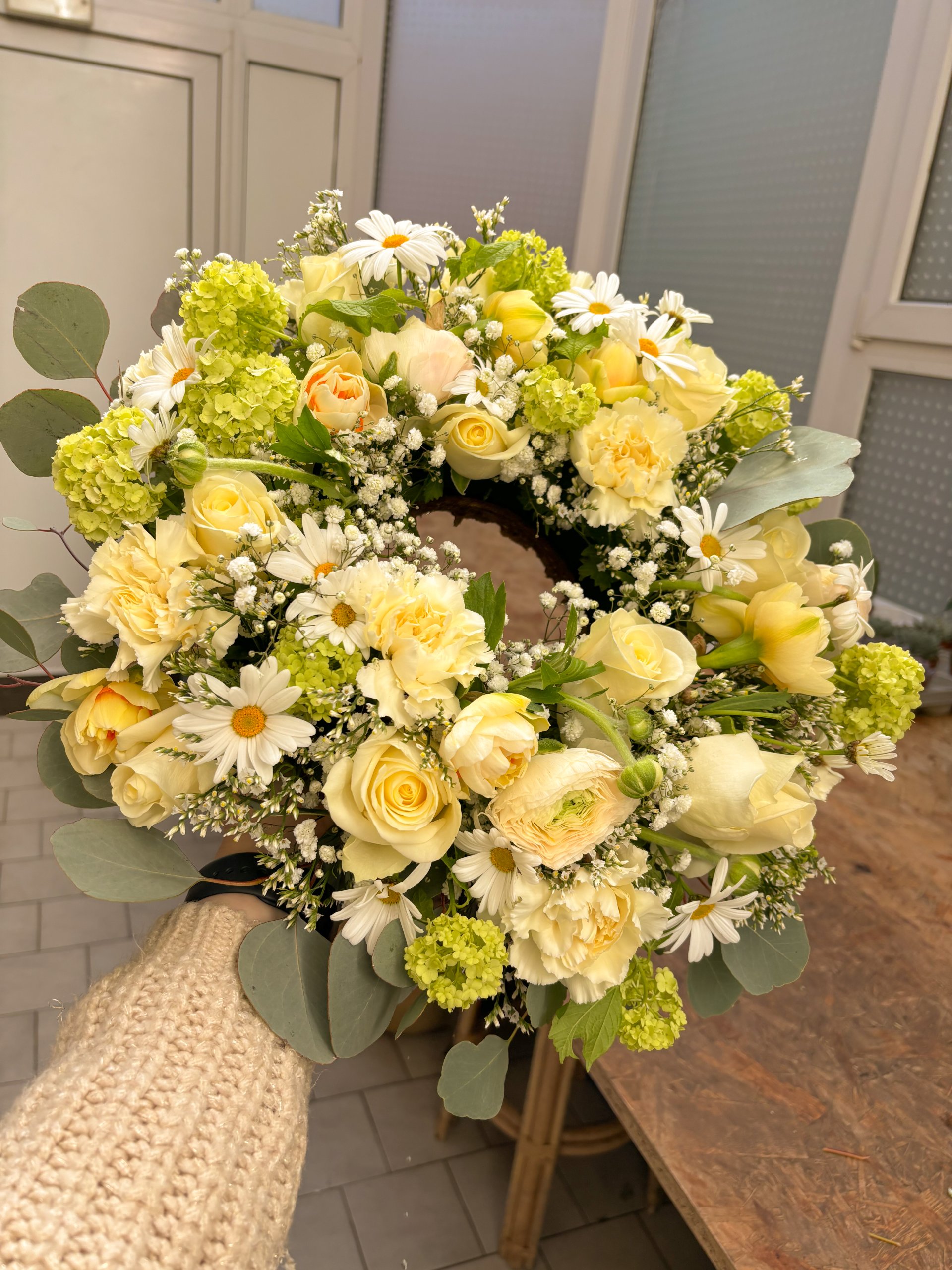 Composition : rose, renoncule, viburnum, narcisse, oeillet, gypsophile, limoneux, marguerite, eucalyptus.