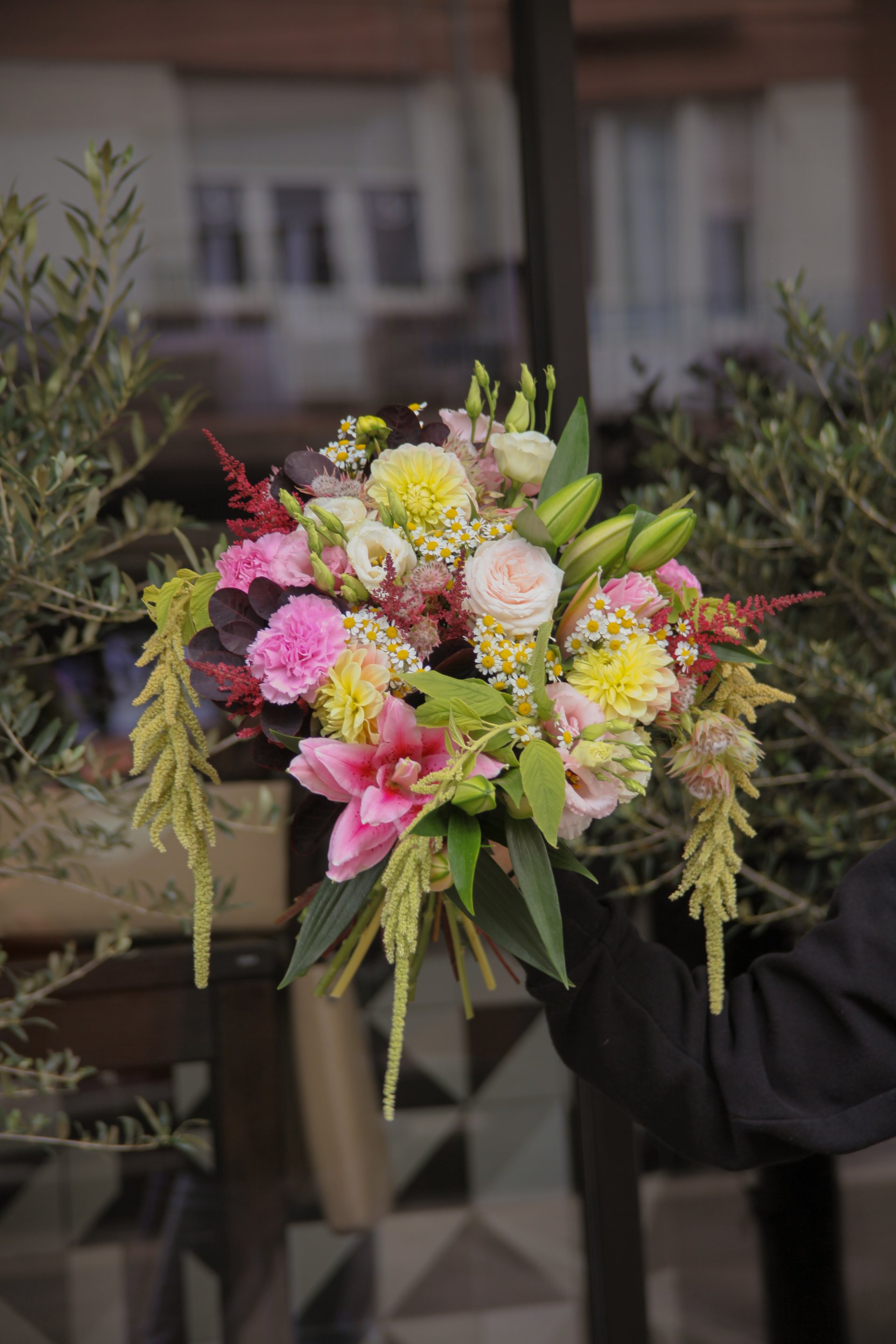 Composition : dahlia, oeillet, lys double, amaranthe, lisianthus, astilbe, lisianthus, camomille, astrencia, rose, cotinus.