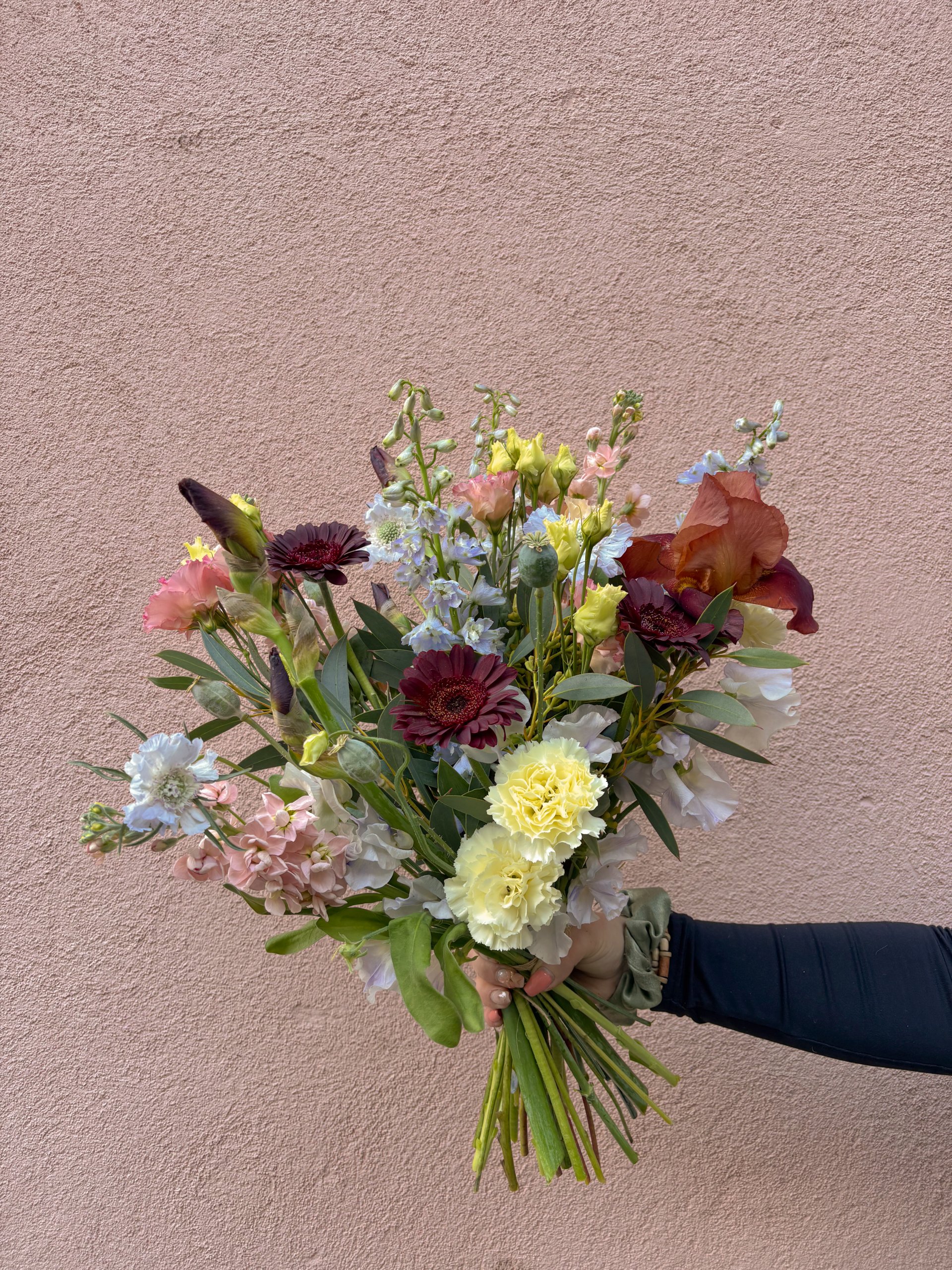 Composition : iris de jardin, oeillet, delphinium, lisianthus, giroflée, scabieuse, pavot, germini, pois de senteur, eucalyptus.