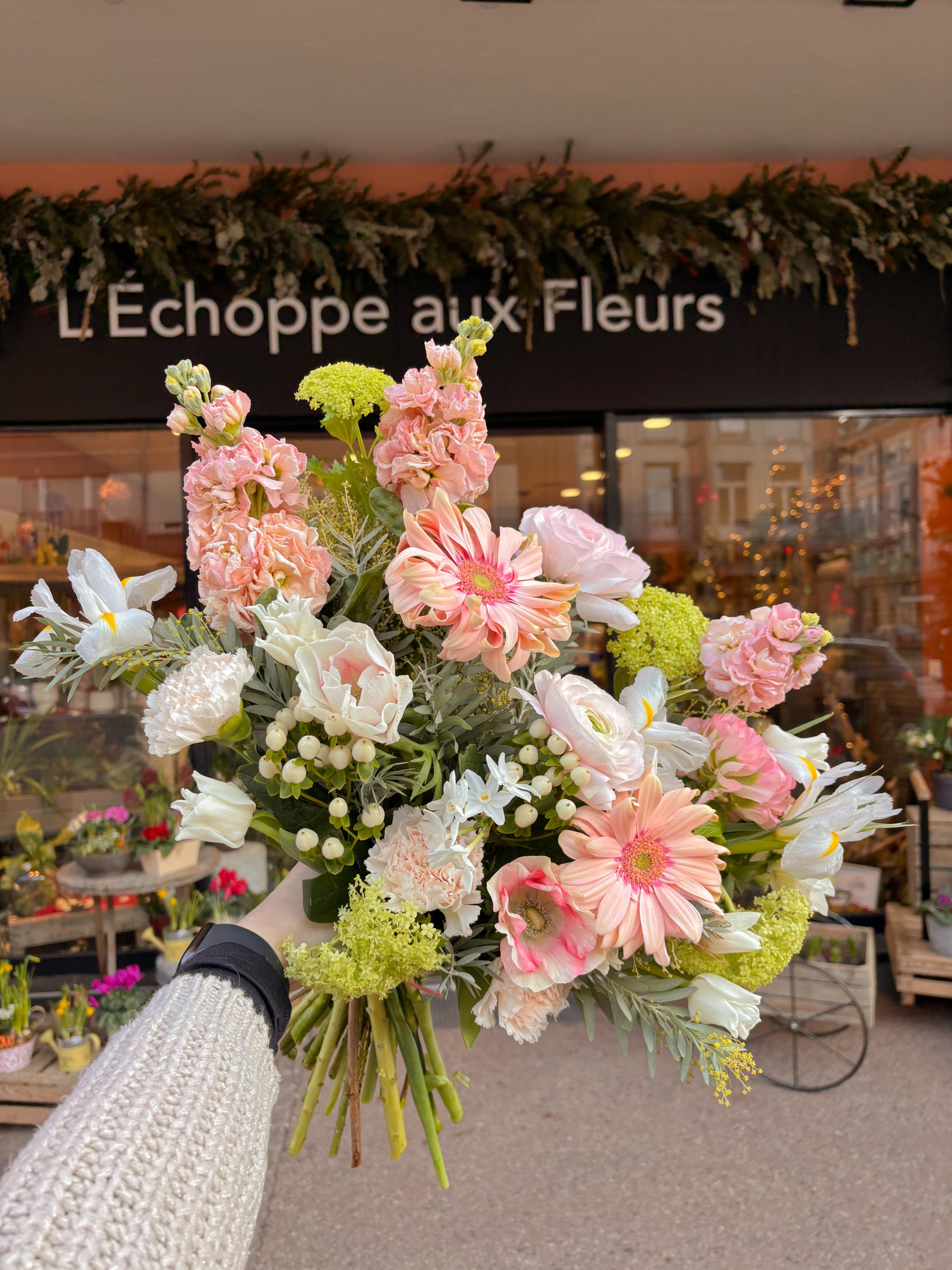 Composition : gerbera, giroflée, anémone, iris, hypericum, renoncule, virbunum, tulipe, oeillet, mimosa.