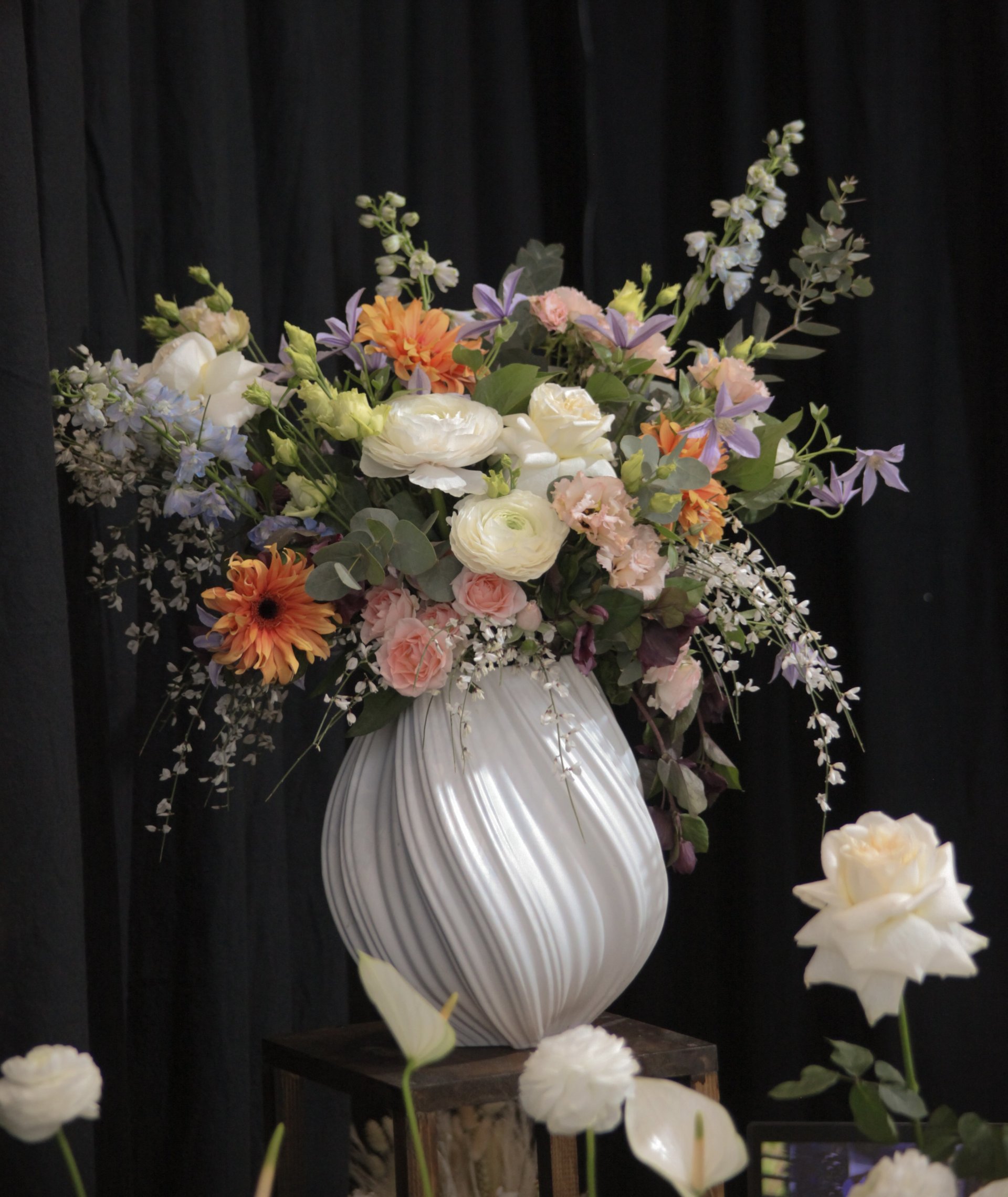 Composition : renoncule, rose, clematite, gerbera, lisianthus, rose branchue, genêt, delphinium, eucalyptus.