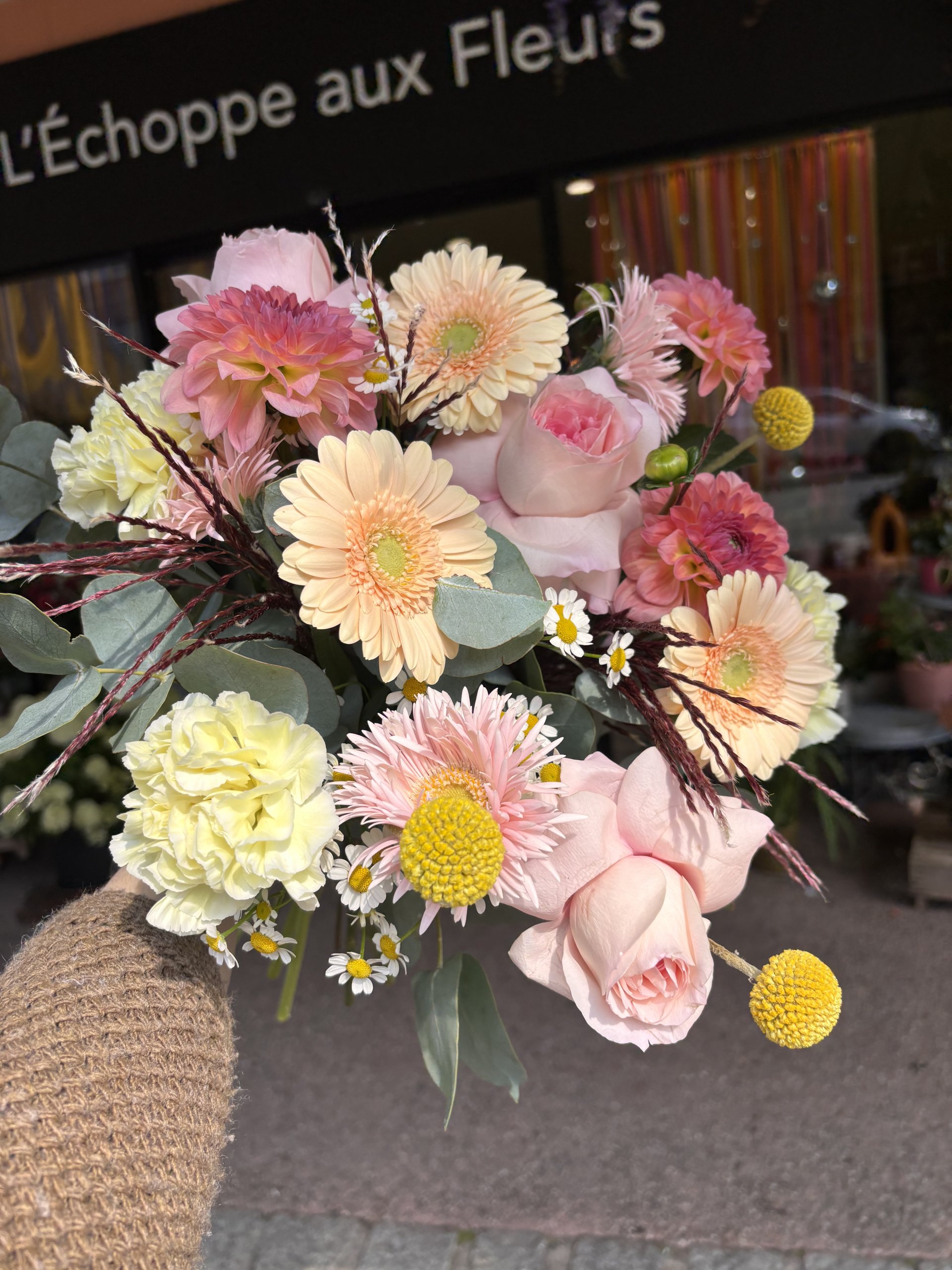 Composition : Rose, germini, oeillet, dahlia, crasspedia, camomille, graminée, eucalyptus.