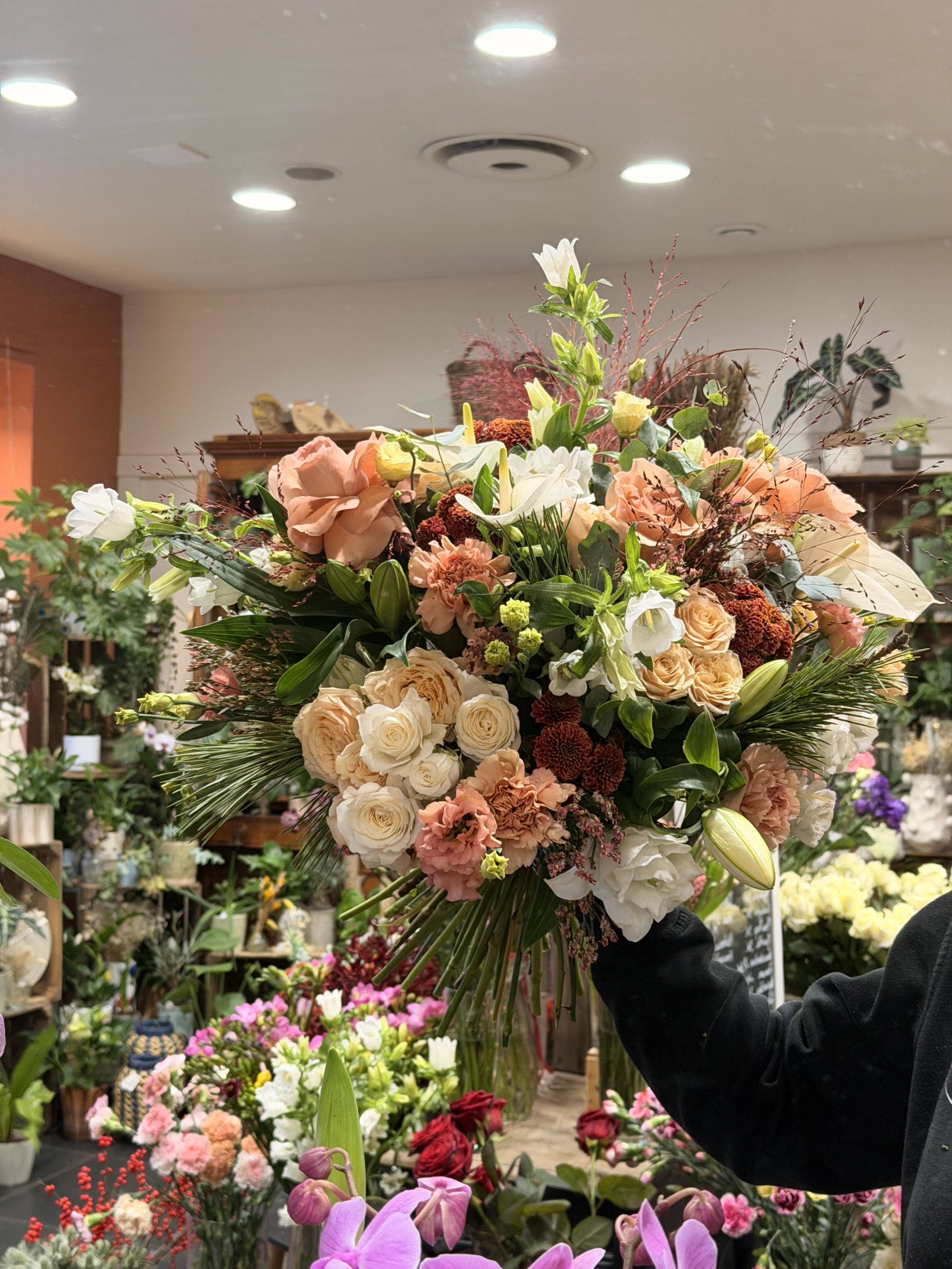 Composition : lisianthus, rose, rose branchue, lys double, anthurium, campanule, santini, limonium, oeillet, graminée, pin, eucalyptus.