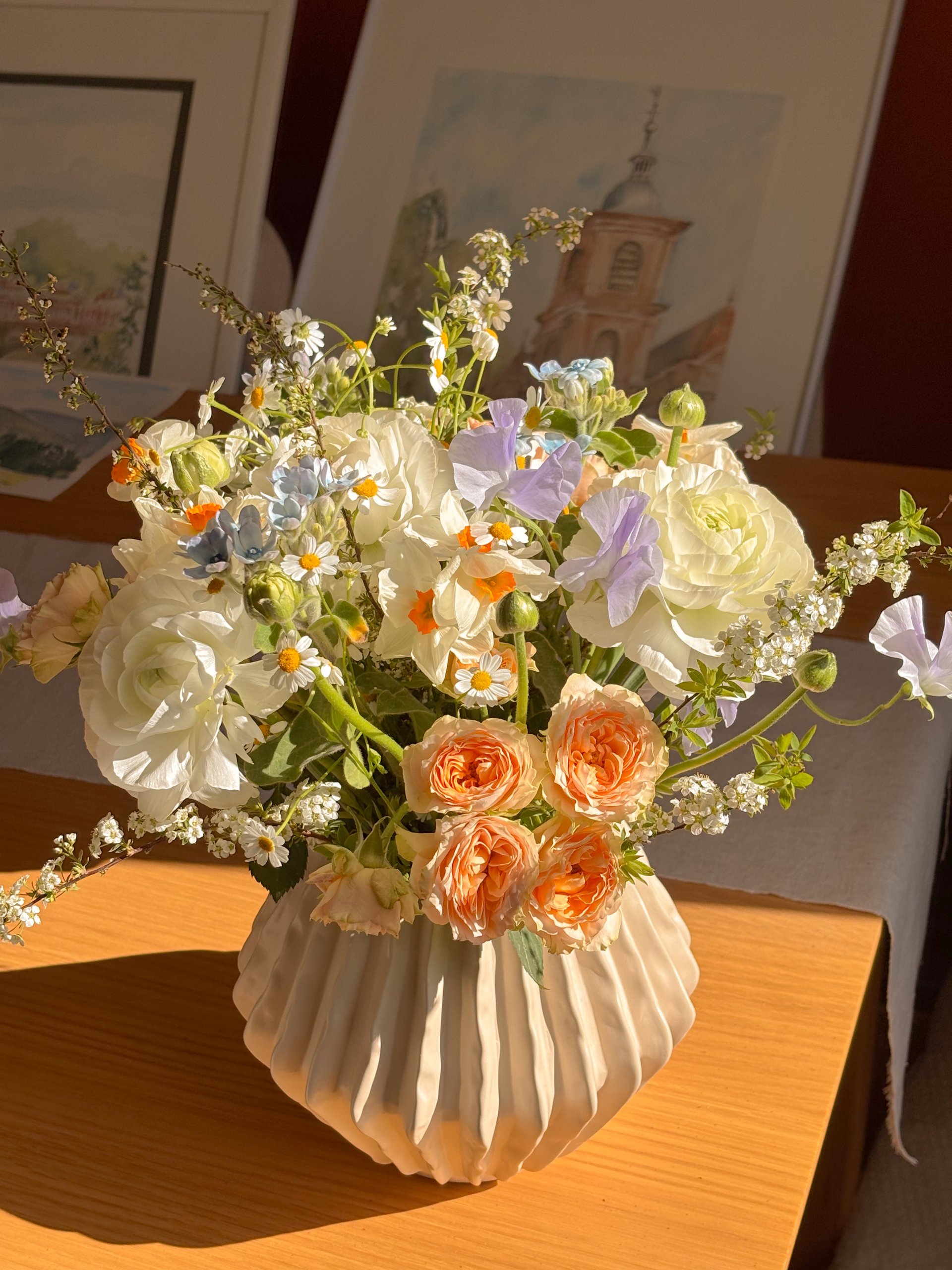 Composition : renoncule, rose branchue, pois de senteur, narcisse, camomille, spirée, oxypetalum.