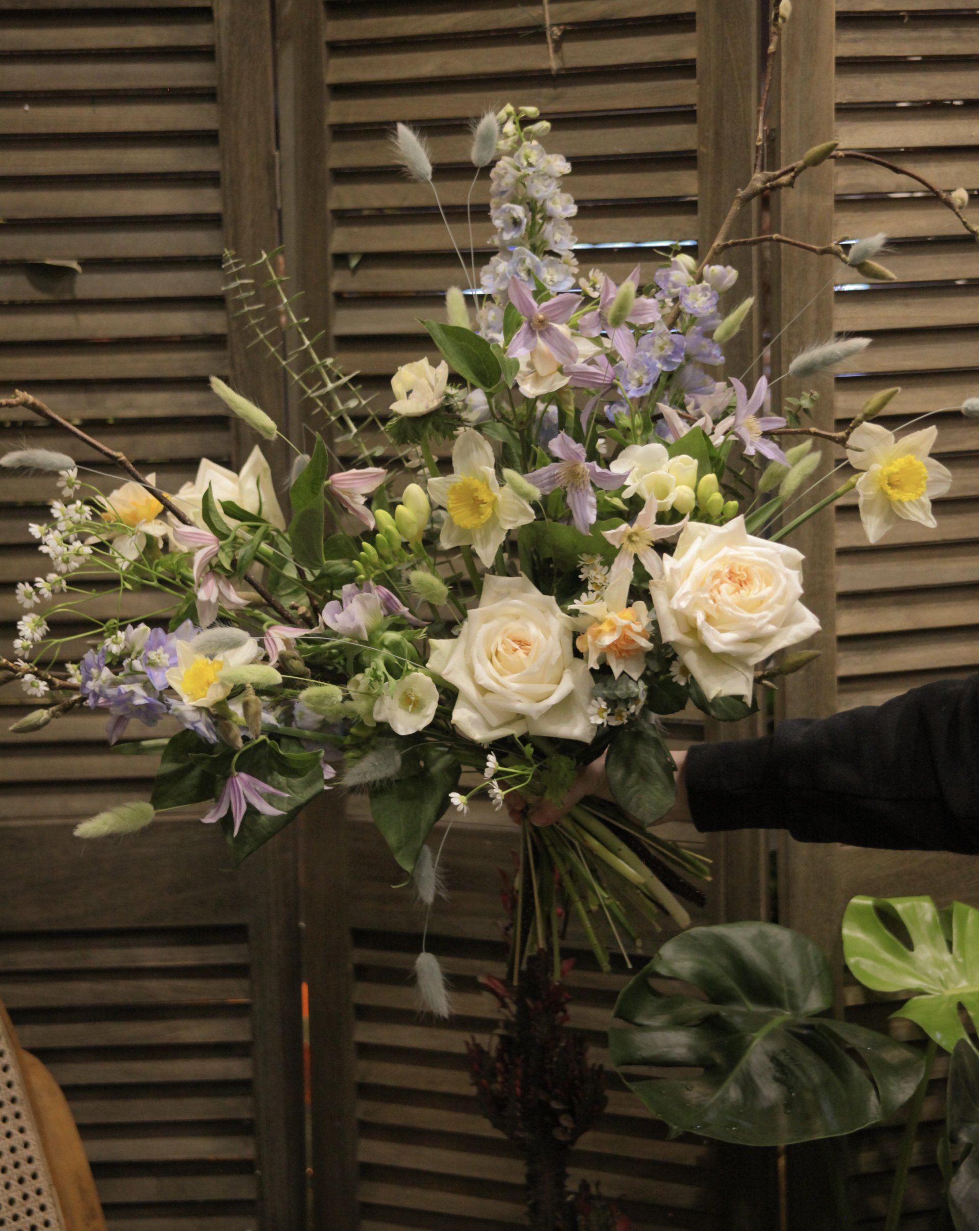 Composition : rose, narcisse, freesia, limonium, clematite, anemone, delphinium, lagurus, magnolia, camomille, eucalyptus.