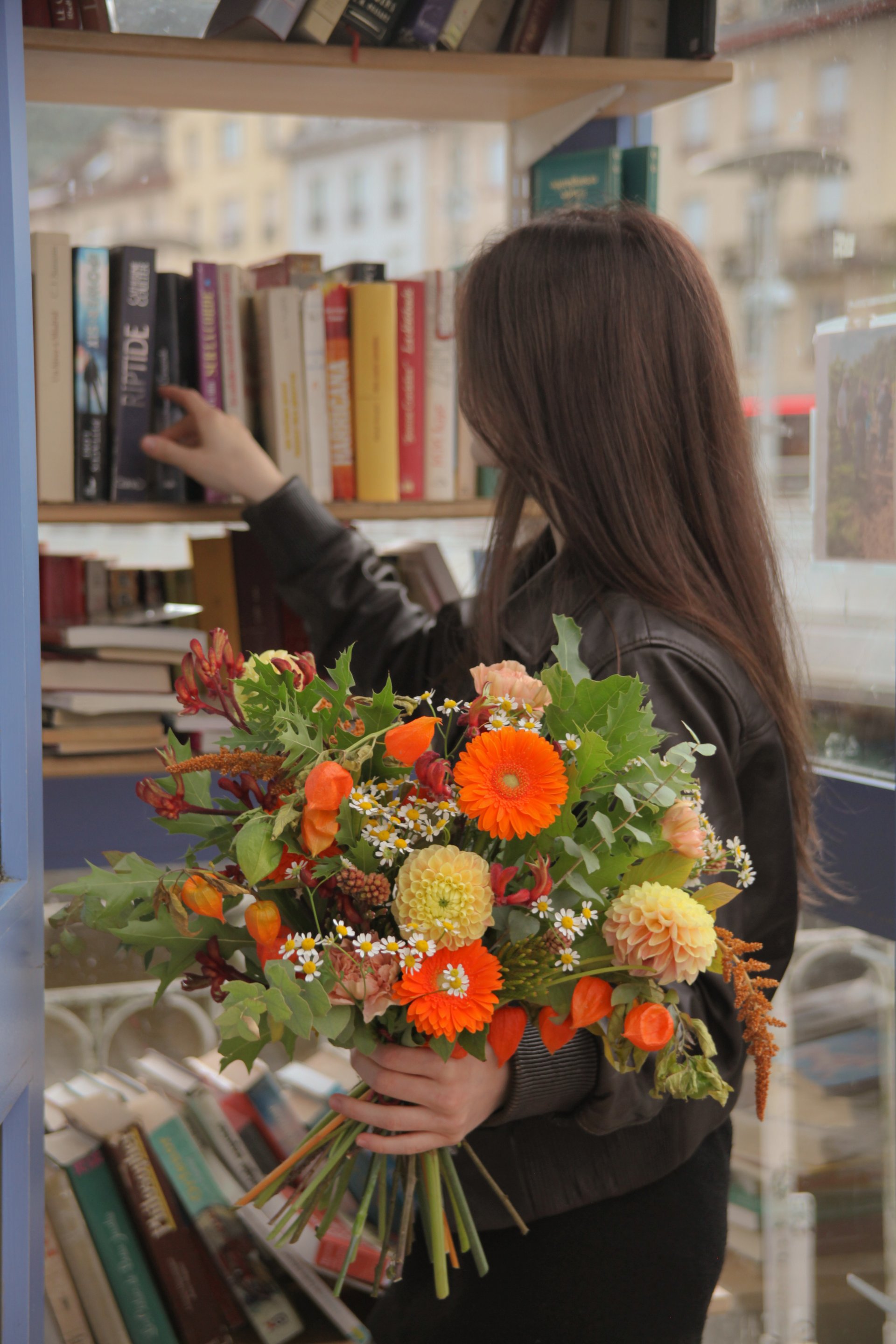 Composition : dahlia, germini, physalis, anigosanthos, amaranthe, camomille, oeillet, mûre, Quercus, eucalyptus.